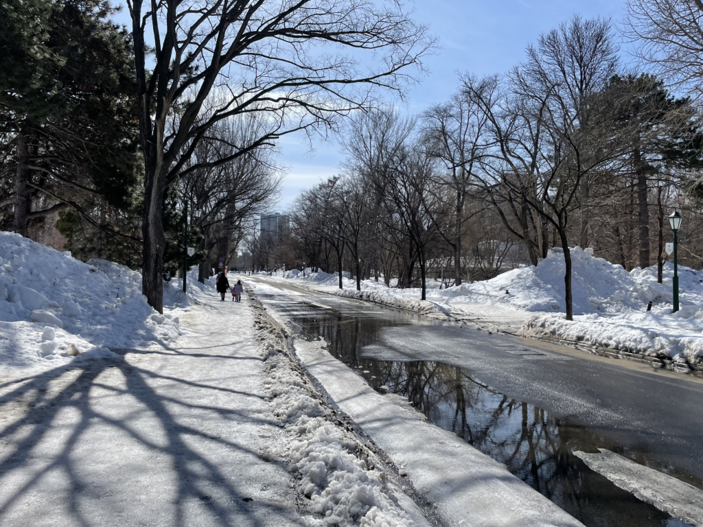 中途半端に融けては固まった雪道。