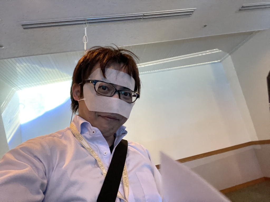 記念撮影は,VRゴーグル装着時でなく,VRゴーグル装着用の布マスク。
