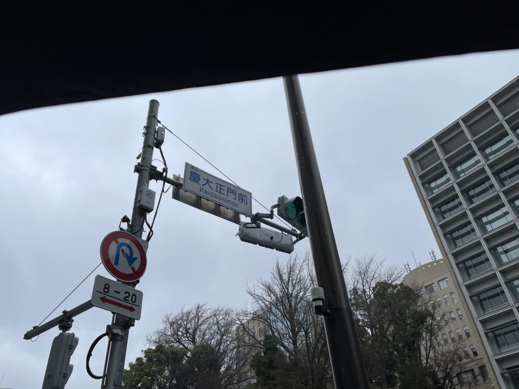 『慶大正門前』。