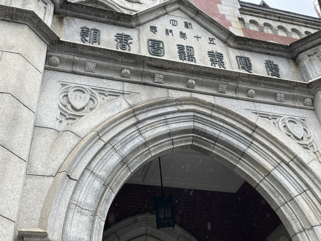 篆書体による『慶應義塾図書館』。
