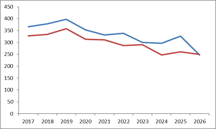男子の人数は昨年から80名も減少しているが,女子はほぼ横ばい。